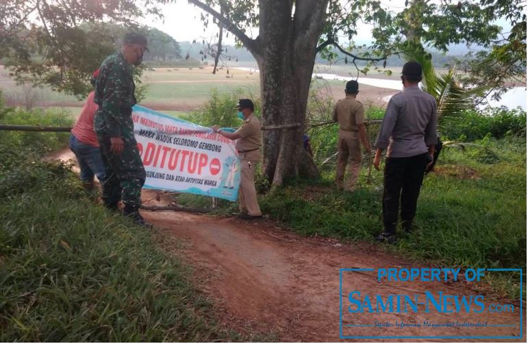 SAMIN-NEWS.com, PATI – Selama masa pandemi untuk kali kedua Waduk Seloromo, di Desa/Kecamatan Gembong, Pati, ditutup untuk pengunjung dan juga kegiatan masyarakat lainnya, untuk memutus mata rantai penyebaran virus tersebut. Penutupan kawasan lingkungan waduk untuk kali yang kedua itu dilakukan oleh Camat Gembong, Cipto Mangun Oneng bersama jajaran Muspika, unsur pemerintahan desa, serta karang taruna setempat, Senin (12/10) pukul 16.00.