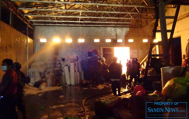 SAMIN-NEWS.com, PATI – Sebuah bangunan gudang plastik di pinggir jalan raya Pati-Gabus, ikut Desa Semampir, Kecamatan Pati, malam ini sekitar pukul 20.30 dipastikan seluruh isinya musnah dilalap si jago merah. Sampai berita ini dibuat pukul 22.00 para regu pemadam kebakaran dari Pemkab Pati. PT Garudafood, tanki BPBD dan juga AW Polres Pati masih berjibaku untuk memadam kobaran api tersebut.