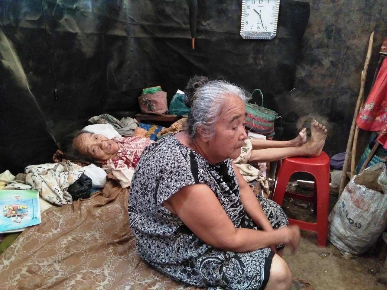 SAMIN-NEWS.COM SEBUAH jam dinding yang terdapat tapi bukan menempel di dinding layaknya sebuah rumah tinggal, melainkan hanya dinding petak ruang di emperan berupa terpal, itulah penghitung waktu yang tak pernah berhenti berjalan karena terus berputar. Bagi penghuni ruang sempit 2,5X3 meter, Mbah Semi (88) dan putrinya Mbok Kasminah, adalah bagian dari perjalanan dan berputarnya waktu tersebut.