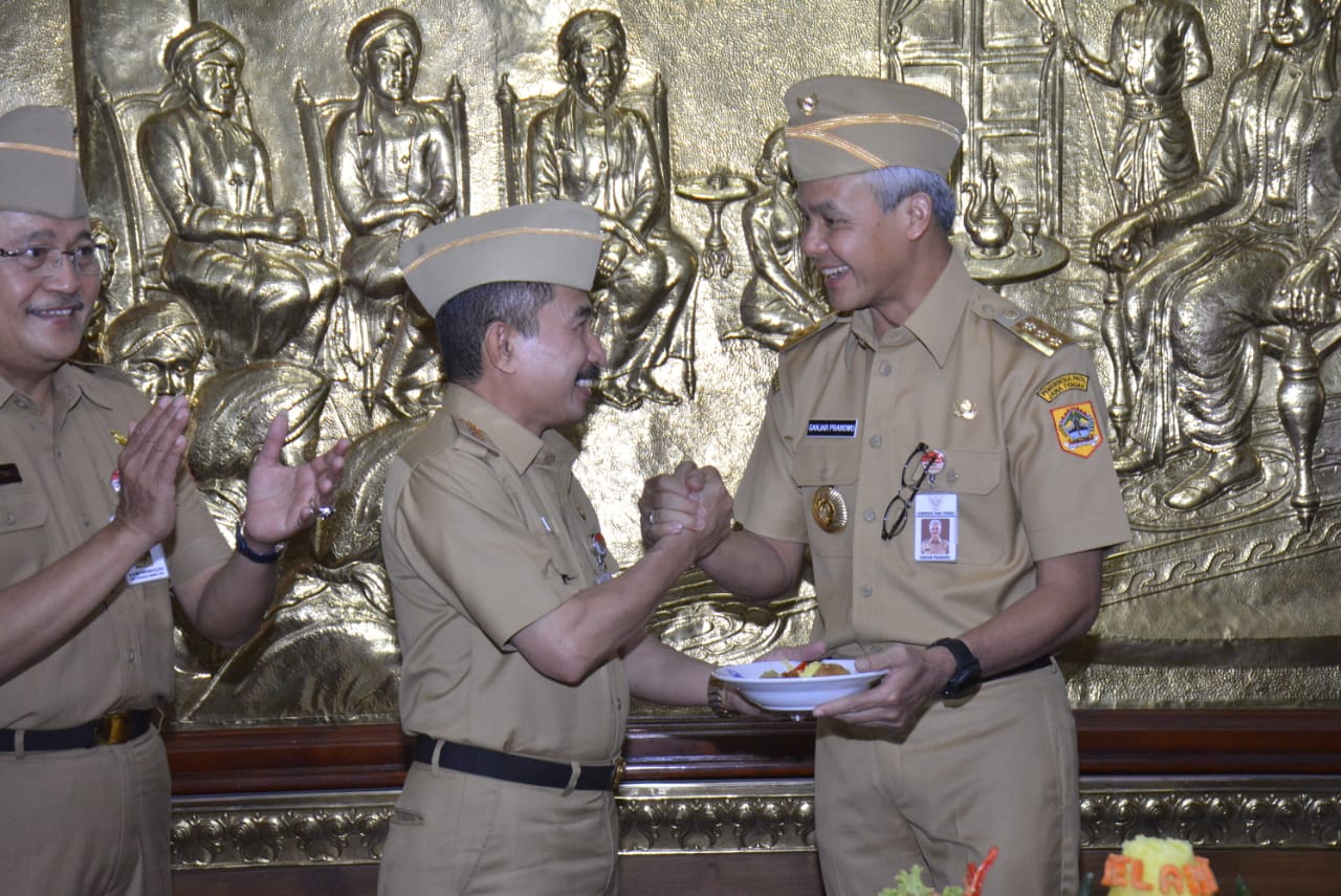 Gubernur Jawa Tengah Ganjar Pranowo yang tadi pagi hadir di Pati, sebenarnya bertindak sebagai Inspektur Upacara (Irup) peringatan Ke-90 Sumpah Pemuda Tahun 2018 tingkat Jawa Tengah yang dipusatkan di Alun-alun Simpanglima Pati. Bersamaan hari ini, ternyata Ganjar Pranowo juga memperingati HUT-nya Ke-50, dan mendapatkan ucapkan selamat dari Bupati Haryanto yang juga sudah menyiapkan tumpeng ulang tahun.(Foto:Sn/dok/humas-aed).