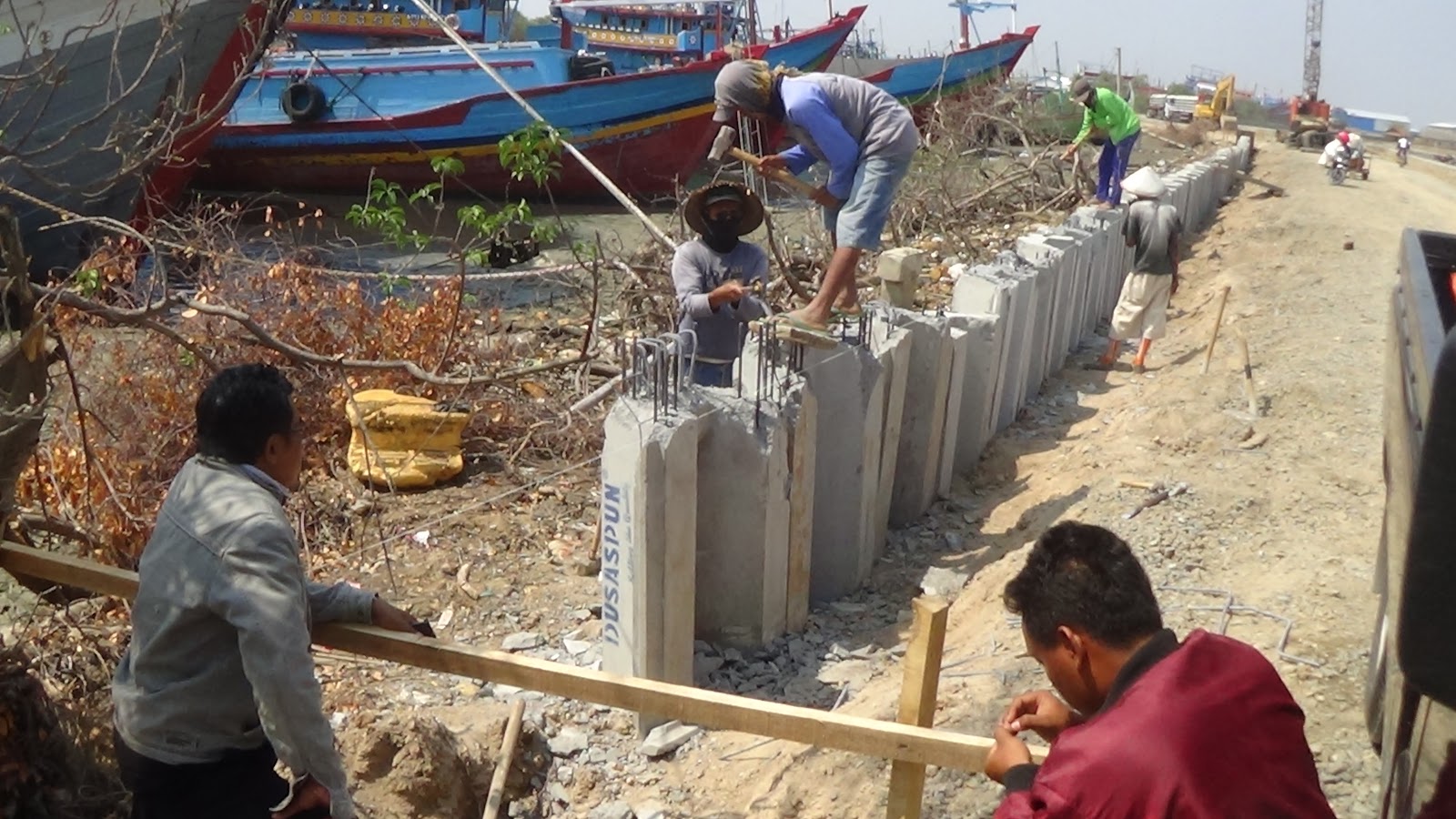 Jumlah material beton pracetak produksi pabrikan yang sudah terpasang seluruhnya 66 batang, karena dari 16 batang pengiriman terakahir yang tertanam baru 2 batang, tapi slang alat berat jenis kraine pecah. Sehingga Sabtu (20/10) kemarin, untuk pekerjaan penanam pancang penahan tersebut untuk sementara terpaksa berhenti.
