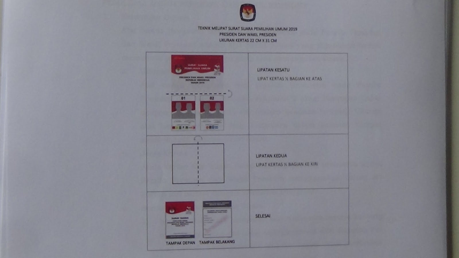 Contoh desain dan teknik melipat surat suara Pemilu Presiden dan Wakil Presiden, untuk pemungutan suara ulang setiap kabupaten/kota sebanyak 1.000 lembar diberi tanda khusus tulisan ”PEMILU ULANG” dalam bentuk stempel empat persegi panjang, atau dicetak untuk surat suara Pemilu Presiden dan Wakil Presiden.(Foto:Sn/aed)