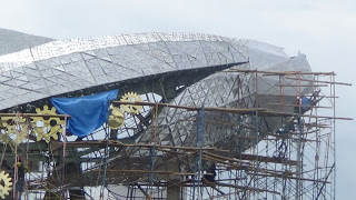 Bagian sisi kiri replika bandeng rasaksa sampai Senin (24/12) hari ini untuk konstruksi sisik belum seluruhnya terpasang.(Foto:SN/aed)