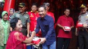 Anggota DPR RI asal Pati, Firman Soebagiyo yang hadir dalam menyambut datangnya Tahun Baru Imlek 2570 di Pati, Kelenteng Hok Tik Bio Pati, disaksikan Buati Haryanto, Kapolres AKBP Jon Wesley, Dandim 0718, Letkol ARM Arief Darmawan secara simbolis ikut membagikan ”kue budaya” kepada warga Pati, Minggu (3/2) siang tadi.(Foto:SN/aed)