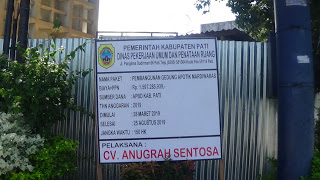 Terpasangnya papa proyek, publik akhirnya tahu bahwa pelaksanaan pekerjaan yang tengah berlangsung di lokasi itu, adalah paket untuk pekerjaan Pembangunan Gedung Apotek Mardi Waras. Alokasi anggarannya bersumber dari APBD Kabuoaten Pati Tahun 2019 sebesar Rp 1,5 miliar lebih dengan 150 hari kalebder dimulai 25 Maret 2019 dan selesai 25 Agustus tahun yang sama.