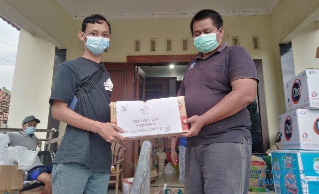 Bantuan TBM Omah Buku disalurkan langsung kepada masyarakat ataupun keluarga terdampak juga didroping ke posko bencana banjir di Balaidesa Mintobasuki, Kecamatan Gabus, Sabtu (20/2).