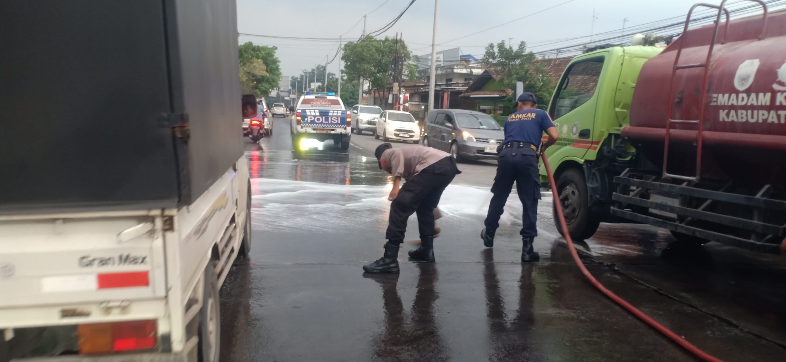 Petugas Polsek Pati Kota bersama Satlantas Polresta Pati segera tiba di lokasi setelah menerima laporan warga. Polisi langsung menutup sebagian jalan, mengatur lalu lintas, serta berkoordinasi dengan Damkar Kabupaten Pati untuk membersihkan tumpahan solar menggunakan air dan detergen.